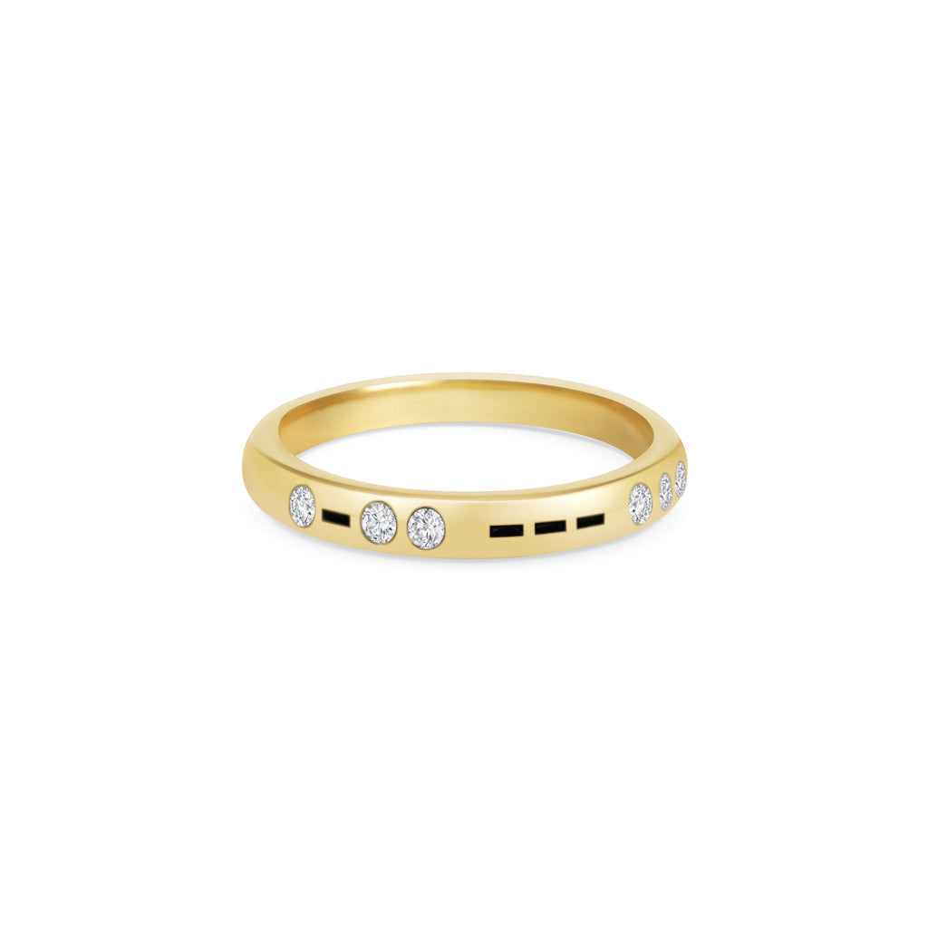 A subtle expression of devotion. This 9k band is set with seven round brilliant cut diamonds nestled between black rhodium-plated dashes, spelling out the world ‘love’ in morse code. Chunky yet stackable, modern yet enduring – this ring is a new Sophie Bretimeyer classic.