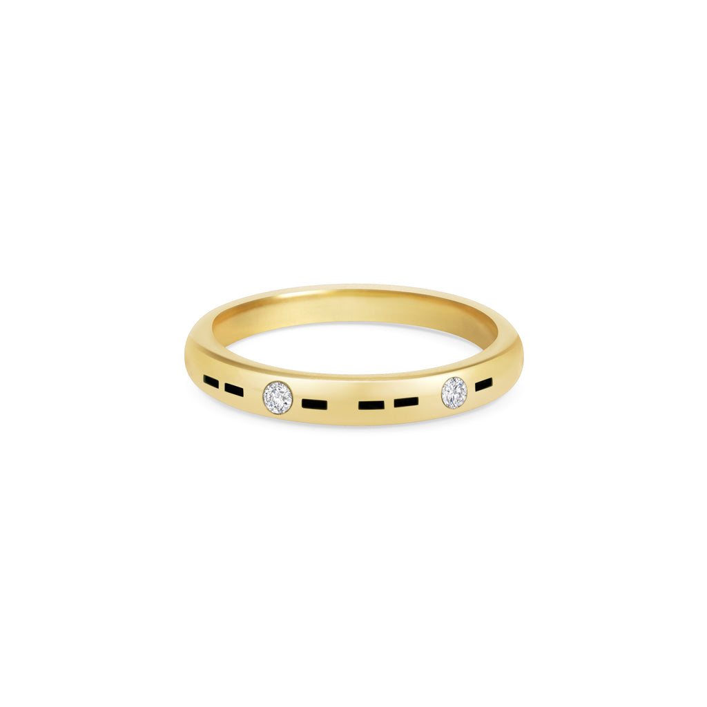 A beautiful gift for the mother figure in your life. This ring keeps the secret of its sentiment, spelling out ‘Mama’ in a morse code pattern of diamonds and black rhodium. Stylishly chunky yet effortlessly wearable, its hardy diamond and 9k yellow gold construction makes it a durable symbol of love made to last.