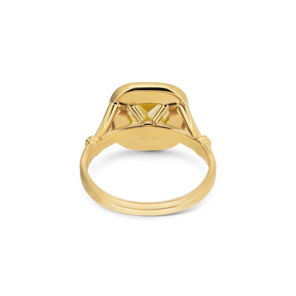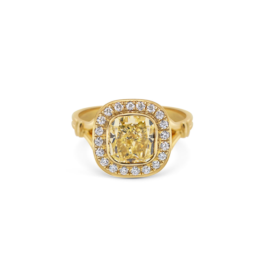 This One-Of-A-Kind engagement ring enchants with the joyful glimmer of its centre stone, a 2.08ct fancy light yellow central diamond. BEZELBEZEL